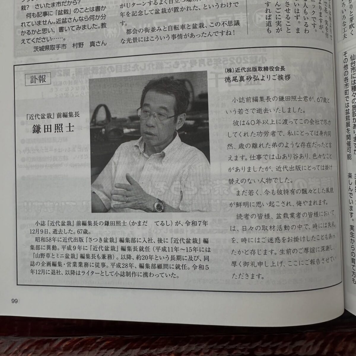 追悼 月刊『近代盆栽』前編集長 鎌田照士(1958-2025)さん🙏