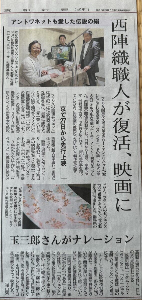 新聞 映画 『京都新聞』 夕刊 一面 2026年3月24日 【新聞メディア】 『#京都新聞』 夕刊 一面 2026.3.24「アントワネットも愛した絹 西陣織職人が復活、映画に京で27日から先行上映 玉三郎さんがナレーション」「世界一美しいと言われた絹で織物をつくりたい」 #細尾真生 プロデューサーの想いから始まったセヴェンヌ種の復活劇。記者の #樺山聡 さんありがとうございました 『読売新聞』朝刊 2026年3月25日 シネスコ 2026年2月17日